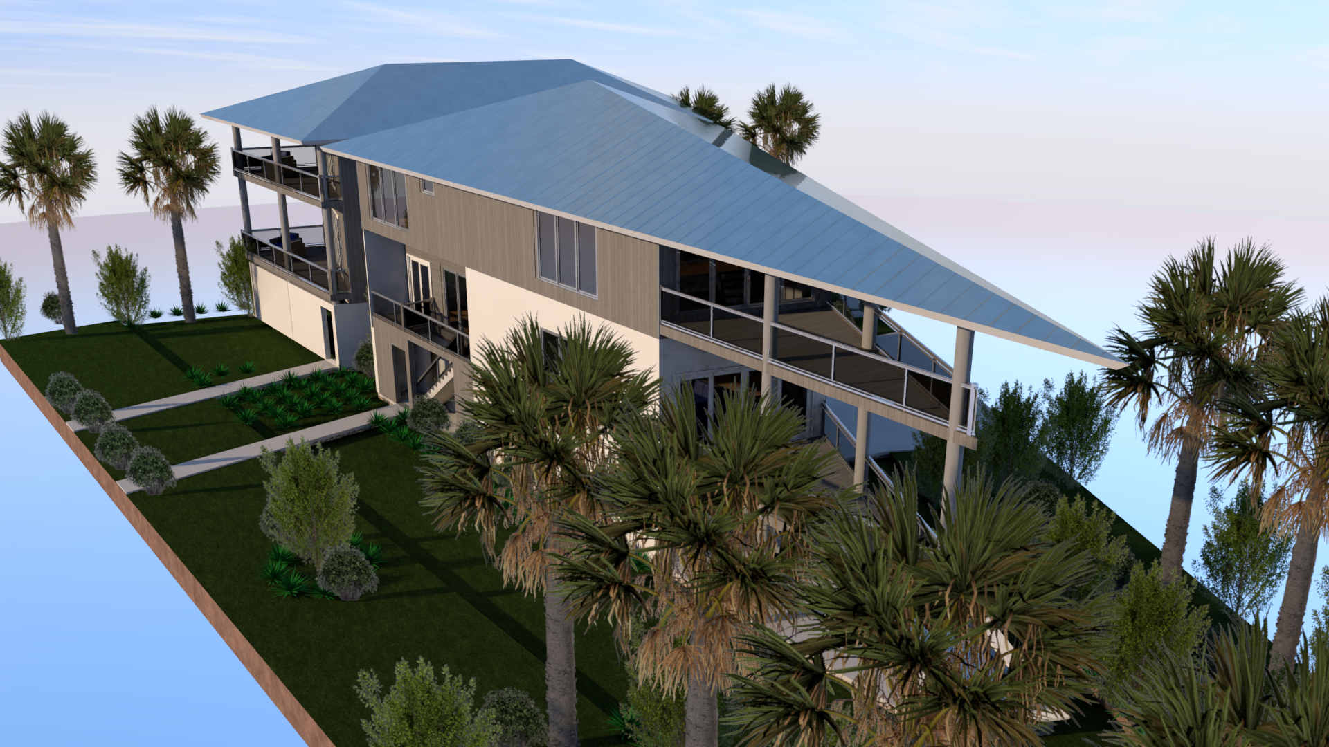 The images shown illustrate two closely related design schemes. One scheme includes an optional rooftop deck with a covered outdoor kitchen, designed to take advantage of Gulf views and enhance rental appeal.
