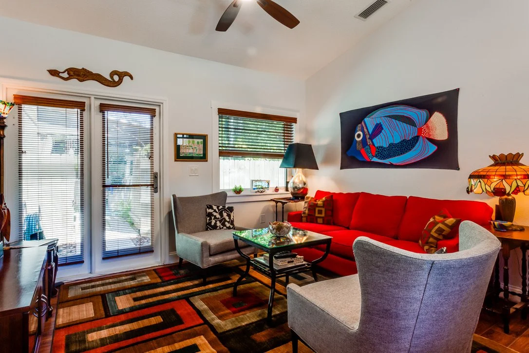 The addition boasts expansive windows and glass doors, inviting the lush outdoor scenery into the living space, while strategically placed smaller windows along the streetside ensure optimal cross-ventilation. Inside, vaulted ceilings and an open floor plan imbue the area with a sense of airiness and freedom.
