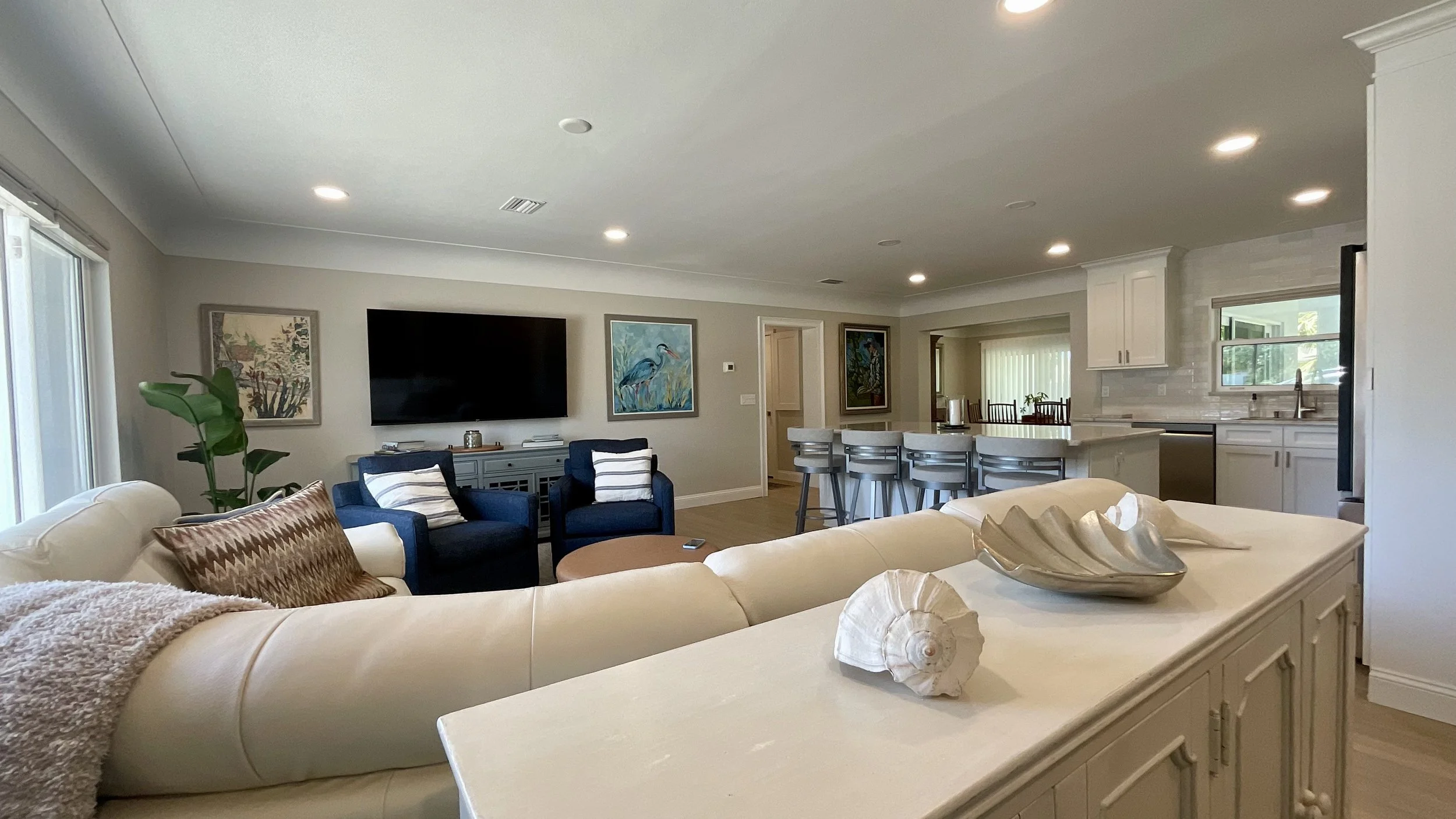 From this angle, you can see how the removal of interior walls creates a spacious, open living, kitchen, and dining area. Sliding glass doors in the dining room open to the future pool, enhancing the seamless connection between indoor comfort and outdoor relaxation. The soothing palette of sand, beige, white, and touches of navy blue adds to the calm, inviting atmosphere. -